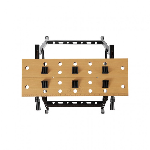 Отверстия в столешнице, а также съемные пластиковые упоры служат для сжатия и фиксации заготовок. Дополнительно верстак оснащен линейкой и транспортиром для точных измерений в процессе работы.