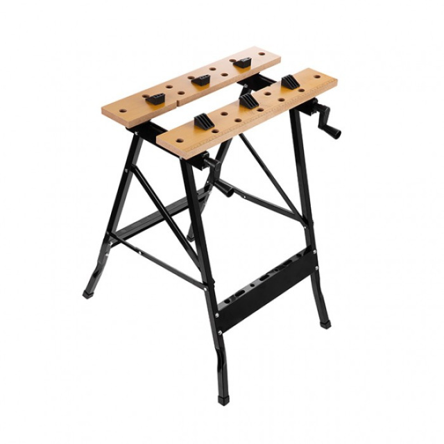 Изготовлен верстак из качественного стального профиля со столешницей ДСП, габаритами 565*200*760 мм и выдерживает равномерную нагрузку до 100 кг. С помощью металлических раздвижных планок станок компактно складывается для последующего хранения и транспортировки.