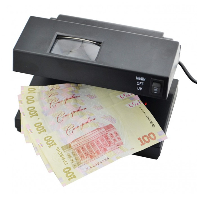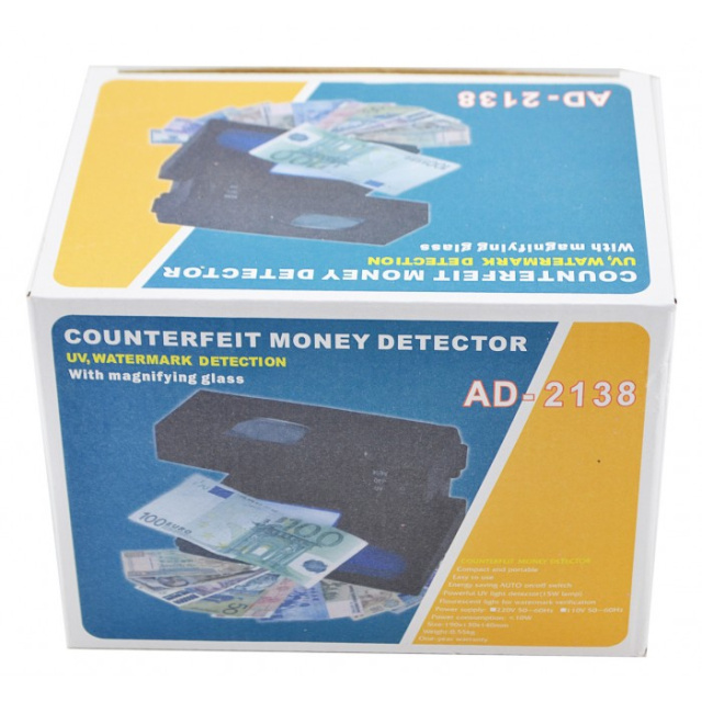 Ультрафиолетовая лампа детектор валют AD-2138 – простое надежное не дорогое устройство контроля подлинности банкнот, выпущено в Азии. Относится к просмотровому ручному типу с самостоятельным определением пользователем подлинности купюр. Имеет функцию ультрафиолетовой подсветки и лупу для увеличения мелких опознавательных деталей. Питание от сети 220 вольт. Автономная работа, возможность подключения через автомобильный прикуриватель отсутствует. У