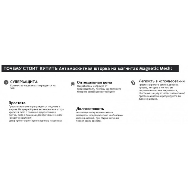 Магнитные шторы препятствуют проникновению насекомых, не нарушая естественную циркуляцию воздуха, задерживает тополиный пух и мелкий сор. При стирке сетка не теряет своих свойств.