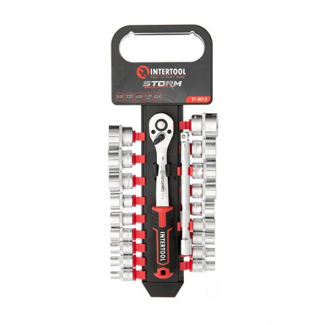 В наборе самые популярные размеры торцевых головок, трещотка и удлинитель для работы в труднодоступных местах.