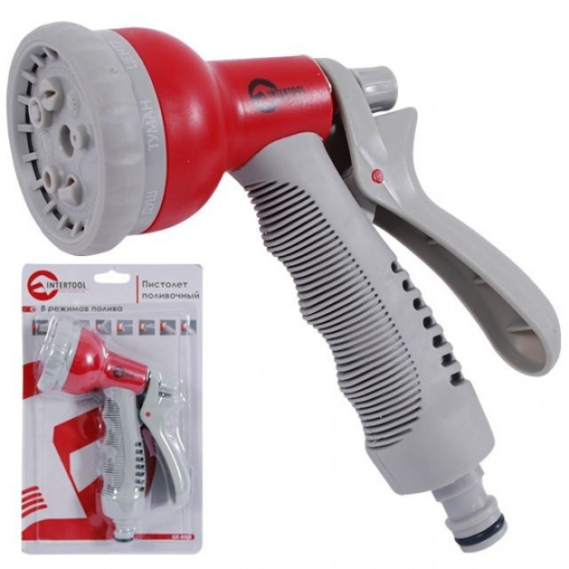 Пистолет-распылитель для полива INTERTOOL GE-0001 может работать в 8 режимах полива – плавная градация от сконцентрированной струи до распыления. Высокое качество материалов и эргономичная конструкция делают его необычайно надежным и удобным в использовании. Незаменимый оросительный аксессуар в Вашей системе полива.