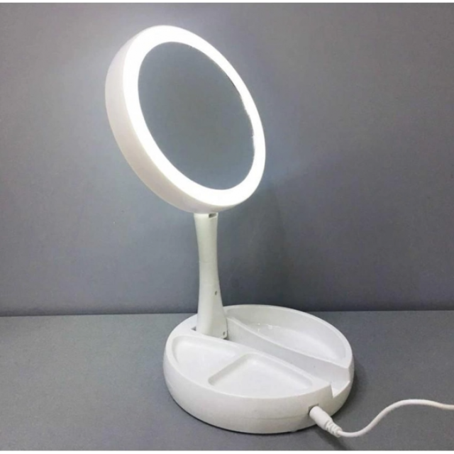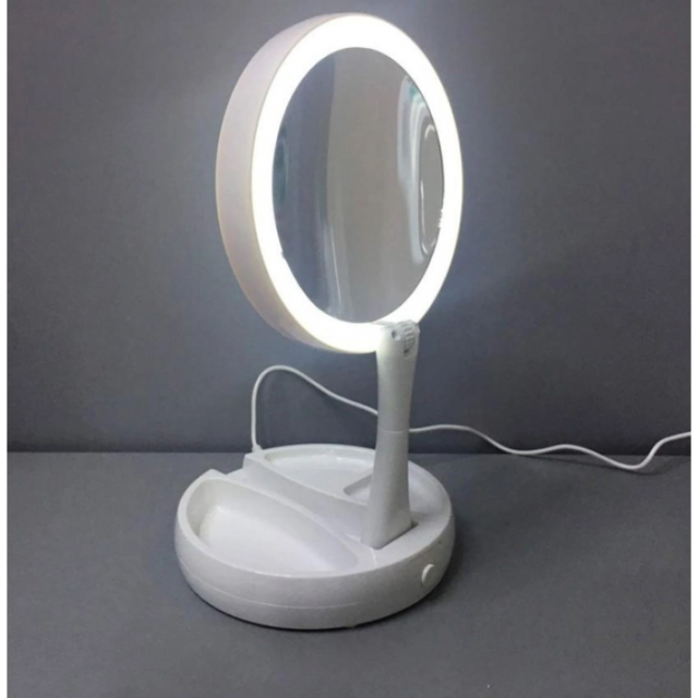 Настольное косметическое складное зеркало с LED-подсветкой для макияжей с боковыми зеркалами, сенсорным датчиком включения и увеличительными секциями. Незаменимая вещь для любой девушки. Светодиоды на зеркале обеспечивают равномерное освещение лица со всех сторон в любое время суток, что позволит вам равномерно нанести косметику, не допуская ошибок. Включить и выключить зеркало можно при помощи специальной сенсорной кнопки. Освещение работает за счет обычных батареек (ААА) или USB подключения (адаптер в комплекте не идёт). Благодаря своей автономности, зеркало станет идеальным помощником не только дома, но и вне его, на даче, на природе. Зеркало легко складывается в два раза и скрывает все свои зеркальные поверхности ударостойким пластиком, что даёт возможность брать его с собой просто положив в сумку, рюкзак, не боясь за его сохранность. Подставка также легко снимается, что делает его компактным и удобным для транспортировки.
