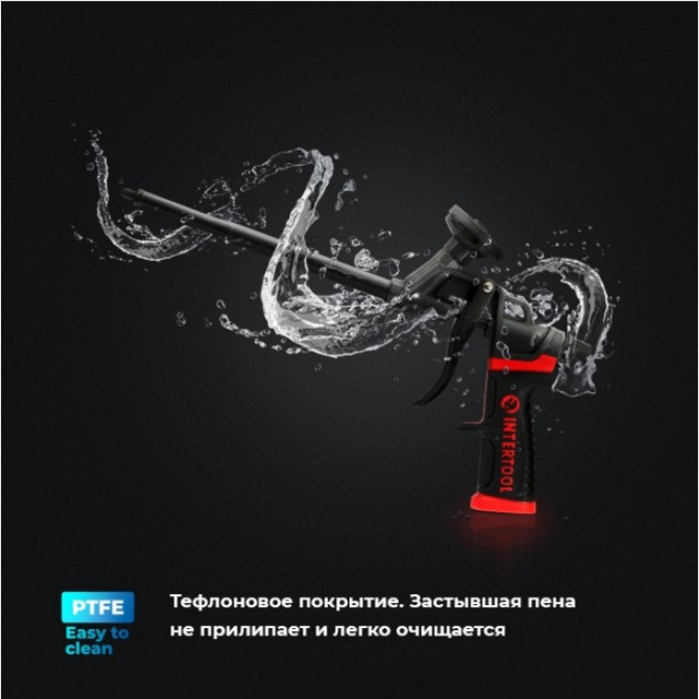 Весь корпус пистолета, а также игла и подающая трубка покрыты тефлоном - застывшая пена не прилипает и легко снимается с пистолета, не блокируя работу пистолета изнутри.