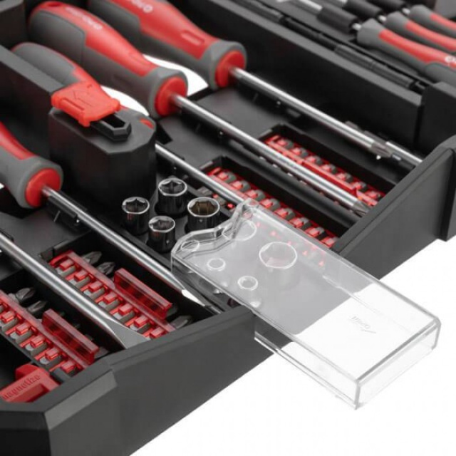 Все инструменты из набора уложены в компактный и удобный кейс на замке. Отвертки, биты и головки надежно посиживают на собственных посадочных местах и не выпадают. Благодаря конструкции из двух створок набор удобно раскрывается перед мастером, позволяя быстро выбрать подходящий инструмент.