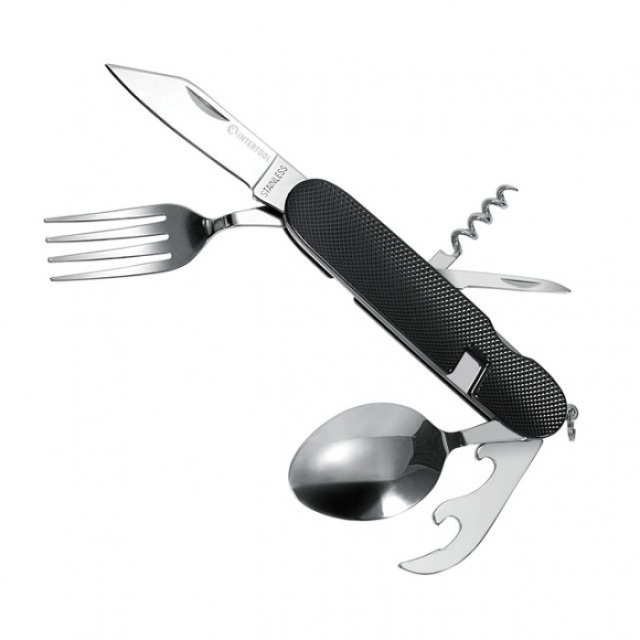 Складной столовый набор включает в себя наиболее необходимые предметы для приготовления и приема пищи: нож, вилка, ложка, открывалки, штопор. Пригодится во время походов, пикников, рыбалки, туризма, в пути и в полевых условиях. Мультитул туристический объединяет несколько инструментов в одном, что позволяет снизить количество необходимых вещей в походе или путешествии. Это сэкономит место в сумке и снизит ее вес.