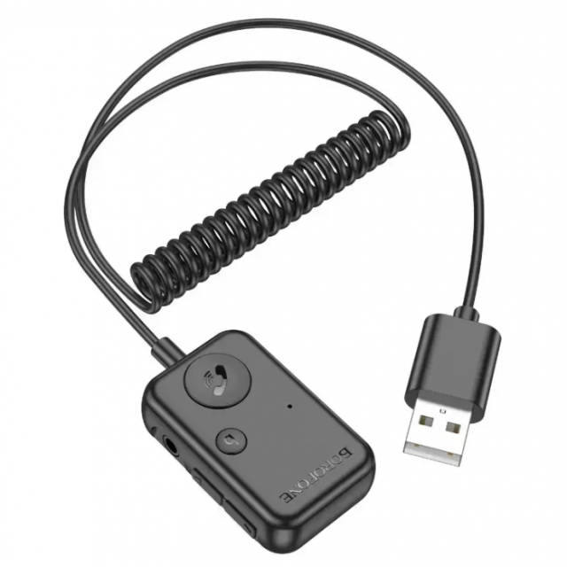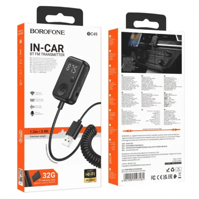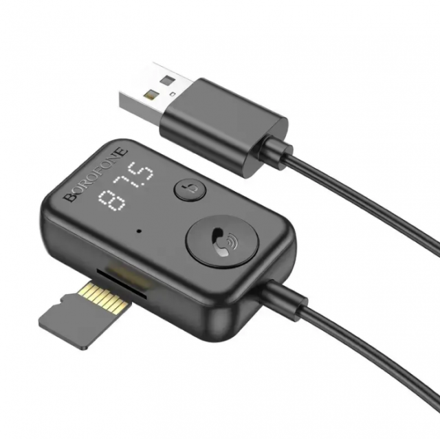 FM трансмиттер Borofone BC49 June - это устройство для проигрывания музыки в автомобиле и использования как гарнитуры для громкой связи. Он подключается через разъем USB и имеет выходной интерфейс AUX 3.5. Borofone BC49 имеет встроенный Bluetooth 5.3, поддерживает воспроизведение с TF-карт объемом до 32 Гб и прослушивание радио. Корпус FM трансмиттера выполнен из качественного пластика и имеет лаконичный дизайн.