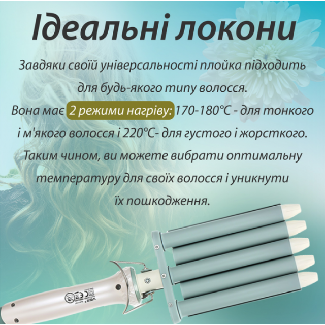 Плойка 5-волновая VGR V-597 для создания роскошных ярких локонов в короткий срок. Плойка пять волн предоставляет Вам возможность разнообразной укладки волос. Пользоваться таким инструментом легко и безопасно. Вы можете с её помощью создать роскошные волны или пышную шапку кудряшек. Потратьте всего несколько минут на укладку, закрепите её капелькой лака или геля, и у Вас будет причёска на зависть любой голливудской звезде. Данная плойка имеет керамическое покрытие, которое медленно, но равномерно разогревается, имеет гладкую поверхность, благодаря чему легко скользит по волосам, не перегревает их, нанося меньший вред по сравнению с металлическими утюжками и плойками. Два температурных режима: 180 и 220 градусов.