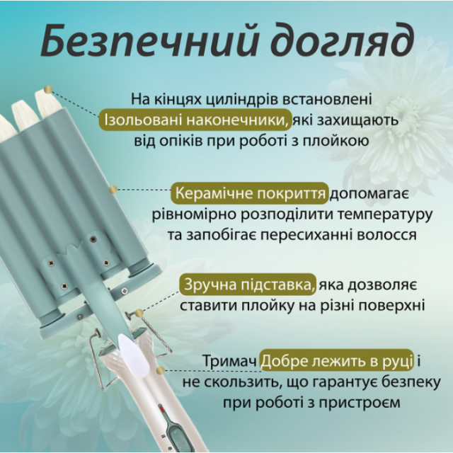 Удобная конструкция данной плойки позволит Вам закручивать очень большие пряди в локоны, что сэкономит Ваше время. Благодаря удобной конструкции головки этой плойки, Вы ни в коем случае не сможете обжечься, когда будете держать ее. Подставка из нержавеющей стали позволит остудить плойку, перед тем как Вы ее уберете, и защитит поверхность от прожигания.