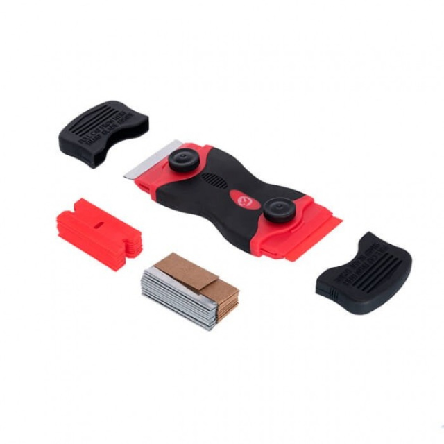 На обоих торцах инструмента расположены сменные лезвия, пластиковые и стальные. Ширина рабочей части составляет – 40 мм. Оба лезвия надежно защищены колпачками, что делает невозможным повреждения при хранении и транспортировке ножа-скребка. В комплекте также поставляется по 10 запасных лезвий каждого вида.