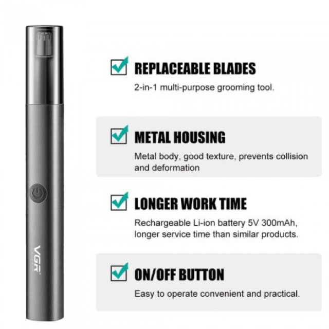 Триммер для носа и ушей V-615 – это профессиональный инструмент для ухода, который сочетает в себе два важных функциональных элемента. Изготовленный из высококачественного металла, мужской триммер обеспечивает надежность и долговечность в использовании. Благодаря эргономичному дизайну машинка для носа удобно лежит в руке, позволяя легко добиваться тяжелых мест.