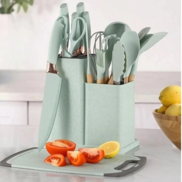 Комплект из 19 аксессуаров включает также набор кухонных ножей, разделочную доску и удобную подставку, благодаря чему может стать отличным презентом начинающему повару, или профессионалу.