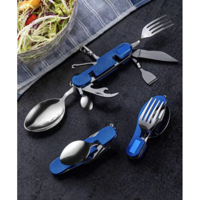 Нож многофункциональный (108 мм в сложенном состоянии)- Нож- Вилка- Ложка (Столовая, чайная)- Штопор- открывалка- Шило- Крючок- Лопатка