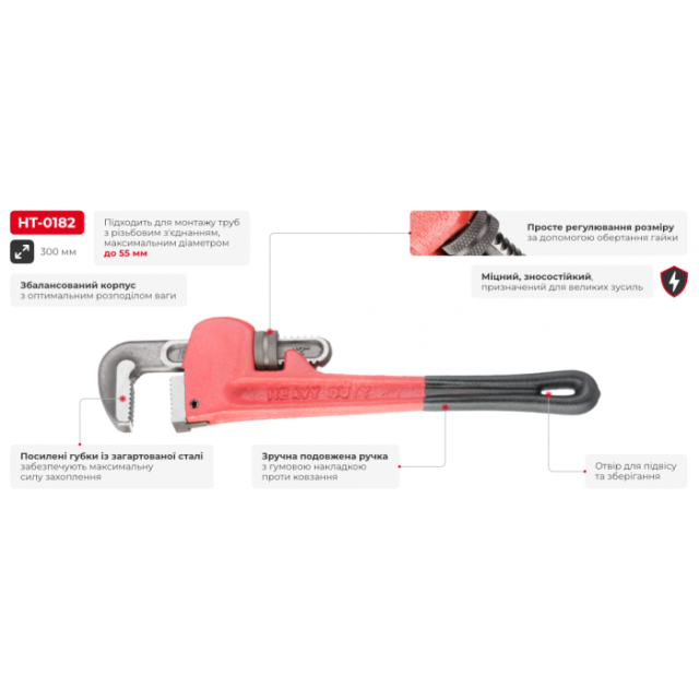 Ключ имеет крепкий цельный корпус с прямой двутавровой ручкой из высококачественной стали. Крюк и усиленные губки позволяют работать с большим крутящим моментом. Захват круглого профиля получается более крепким благодаря проточке в виде зубцов на внутренней стороне. Ключ имеет порошковое покрытие против коррозии.