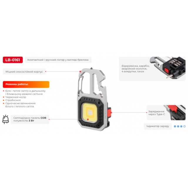 В конструкции карманного фонарика также есть: открывалка, карабин, аварийный молоток, 4 отвертки, крючок.