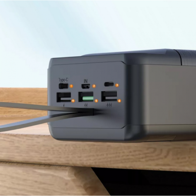 В торце повербанка находятся разъемы Micro-USB и Lightning, пара USB портов с общей силой тока на выходе 2А, ​​USB порт с выходной мощностью 22.5Вт и работающий в обе стороны разъем Type-C с выходной мощностью 20Вт. Максимальная мощность на входе – 18Вт.