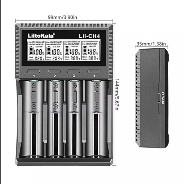 LiitoKala Lii-CH4 имеет большой контрастный дисплей с цветной подсветкой, на котором отображается информация о процессе зарядки: процент заряда в %, тип аккумулятора, напряжение, ток зарядки.