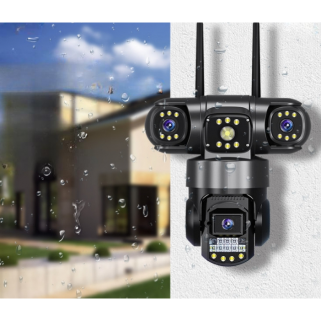 Многофункциональная уличная IP-камера с четырьмя объективами и возможностью одновременного наблюдения за тремя зонами. Поддержка Wi-Fi, управление через приложение V380 PRO, ночное видение, запись на карту памяти и облако.